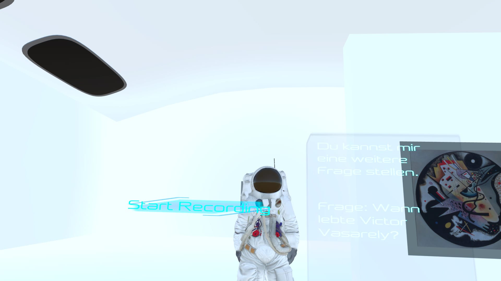 The conversation and recording controls support spoken interaction with the experience. Players can open conversation mode, record a spoken question, and stop the recording to trigger a response. In this way, the desktop versions preserve one of the project’s central ideas: engaging with the exhibition not only visually, but also through dialogue.